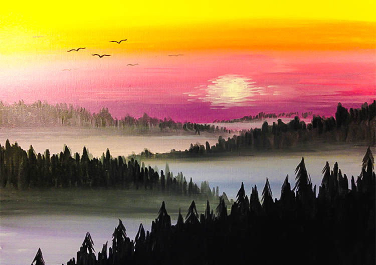 Virtual Paint Nite Misty Mountain Sunrise Ages 13 Painting Classes Los Angeles Coursehorse Yaymaker